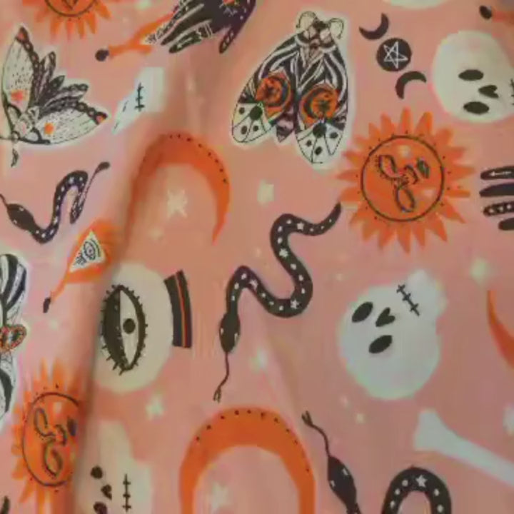 Feel a bit spooky this Halloween with our 🎃🧙 Orange Halloween FLANNEL 🧙🎃 Fabric! It's got 🔮 Crystal Balls 🔮, 🦋 Moths 🦋, and 💀 Skulls 💀 all in a beautifully retro orange background. Add some style to those costumes with this mystical material!