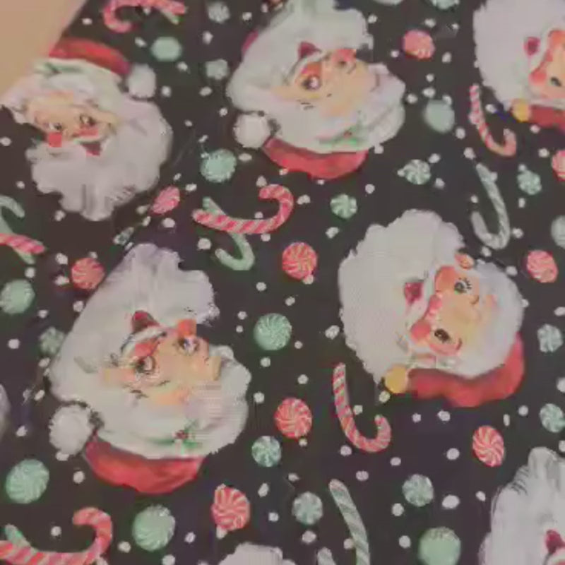 Spread 🎄 cheer with this 🤶 jolly 🎅 Christmas fabric! Put a festive spin on any sewing project with this cotton print featuring our beloved Jolly Santa and Candy Canes on a bold 🖤 black background. Make it merry! 🎁