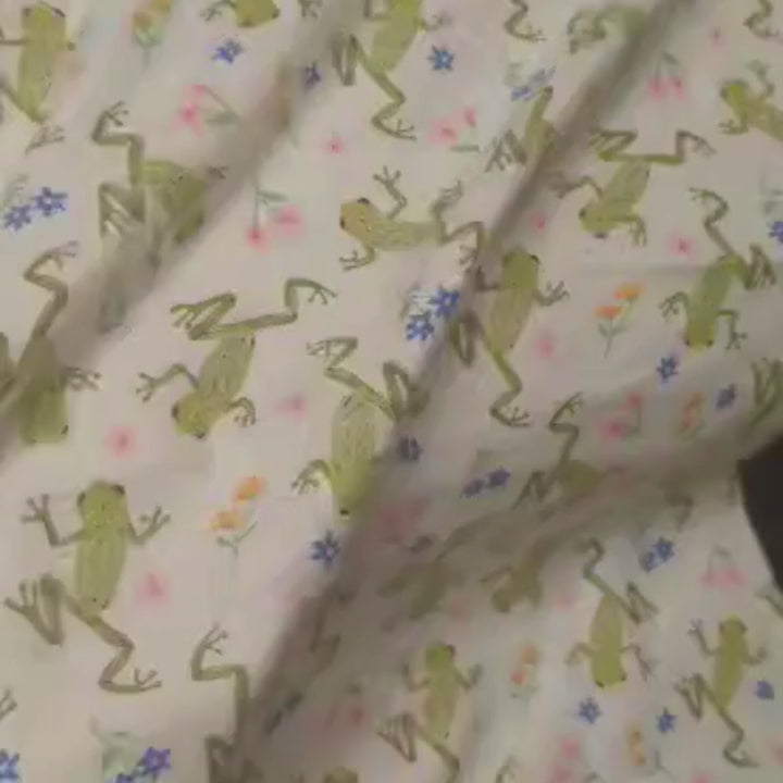 Tissu en flanelle doux et confortable avec de jolies grenouilles vertes accompagnées de fleurs pastel vibrantes, le tout sur un fond blanc éclatant. Parfait pour se blottir et sauter dans le lit !